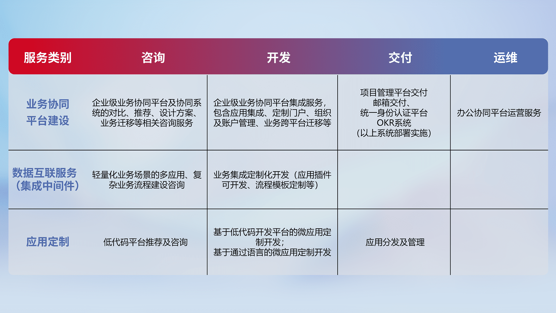 针对钉钉、、企微、、IDaas等平台级产品提供产品的规划、、、方案、、、、交付、、定制化开发等服务,,,,实现如统一协同办公、、、、智能客户服务、、、、混合会议管理、、、、智能数据查询、、、等业务场景,,实现数字化转型。。。。