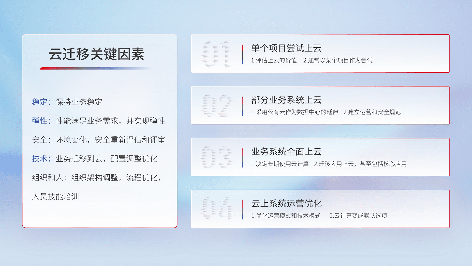 结合实际业务,,,从规划设计、、、、云平台选型、、、、云原生改造、、数据迁移、、、、集成交付,,,,迁移全过程为客户识别最佳上云路径,,做好风险识别管理,,,,设计网络架构、、身份权限、、、安全审计合规、、、、操作审计、、日志审计、、、、监控告警策略、、、、多站点容灾设计等,,对云上基础设施进行整体规划,,提升IT治理水平,,,,以满足弹性、、高可用、、、、高性能的需求。。。。