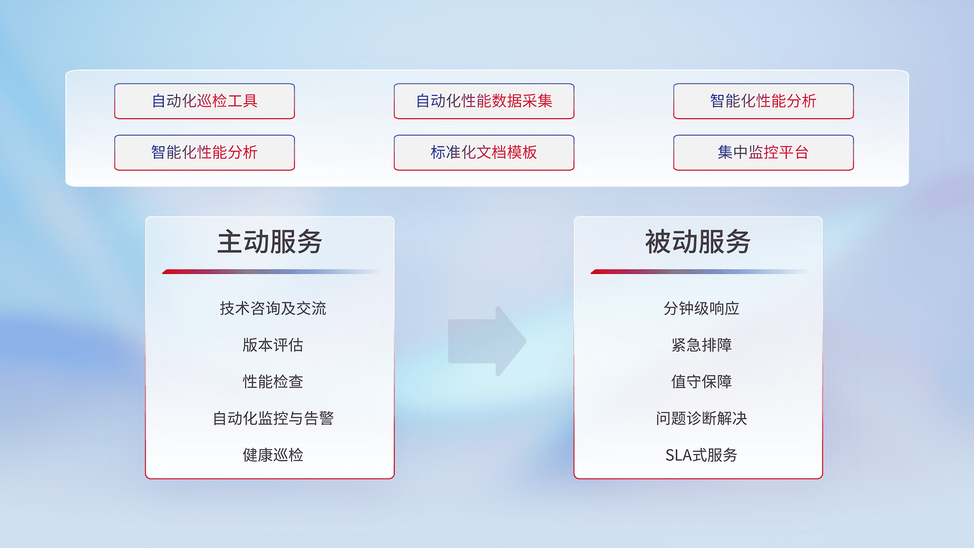 智能化工具和标准化文档,,,,保障服务质量,,,提供主动服务(包含技术咨询、、、版本评估、、、、性能检查、、自动化监控与告警、、健康巡检)和被动服务包含(分钟级响应、、、、紧急排障、、、、值守保障、、、问题诊断解决、、、、SLA服务)。。。